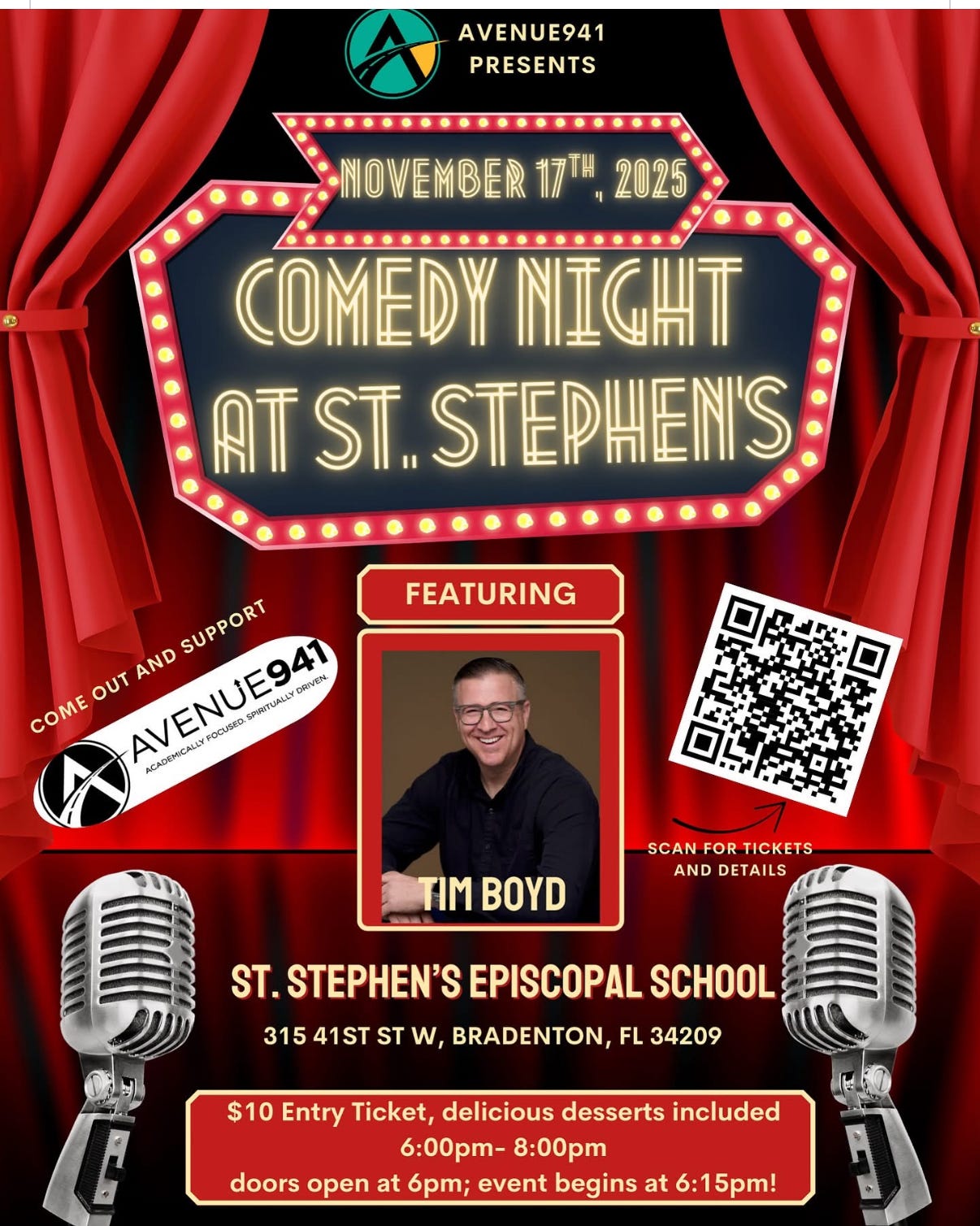 The week concludes on Monday, November 17, when Avenue 941 presents Comedy Night at St. Stephen’s Episcopal School in Bradenton from 6 p.m. to 8 p.m., featuring comedian Tim Boyd, desserts, and community fellowship.