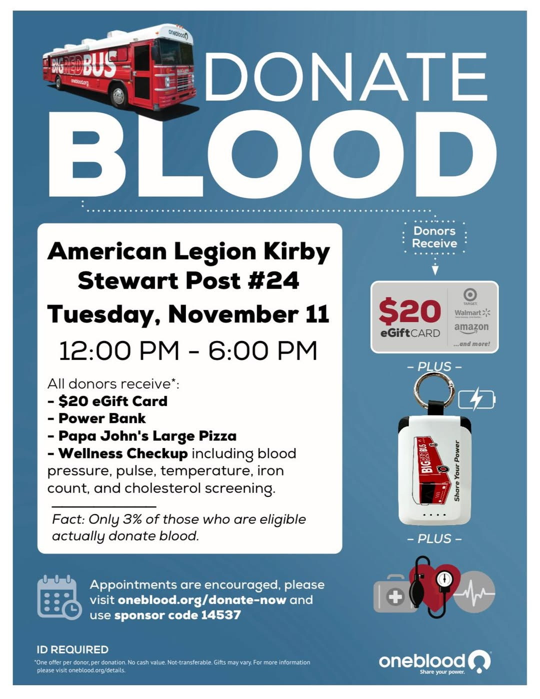 At American Legion Kirby Stewart Post #24 in Bradenton, OneBlood’s Big Red Bus will be collecting donations from 12:00 p.m. to 6:00 p.m., with donors receiving a $20 eGift card, a power bank, and a pizza voucher.