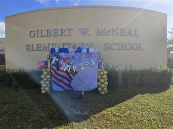 McNeal Elementary School honored veterans in a unique way with a "reverse parade," where staff and students lined up to wave flags and cheer as veterans drove through the school’s parking lot. The Lakewood Ranch High School Marching Band and JROTC added to the festivities, creating a vibrant display of appreciation.