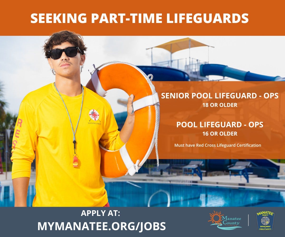Manatee County is currently accepting applications for part-time Pool Lifeguard OPS and Senior Pool Lifeguard OPS positions. The starting pay for these roles is $18.48 per hour, and applicants are required to hold a Red Cross Lifeguard Certification.