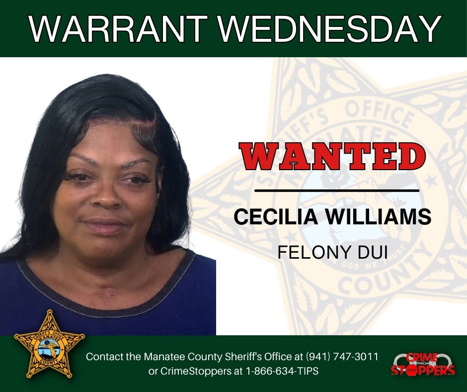The Manatee County Sheriff’s Office is asking for the public’s assistance in locating Cecilia Williams, who is currently wanted in connection with a felony DUI charge involving a fourth subsequent violation.
