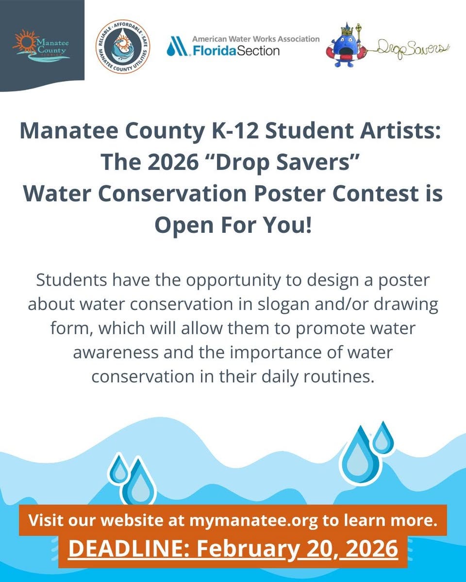 Manatee County K-12 students are being encouraged to put their creativity to work for a good cause as the 2026 Drop Savers Water Conservation Poster Contest officially opens.