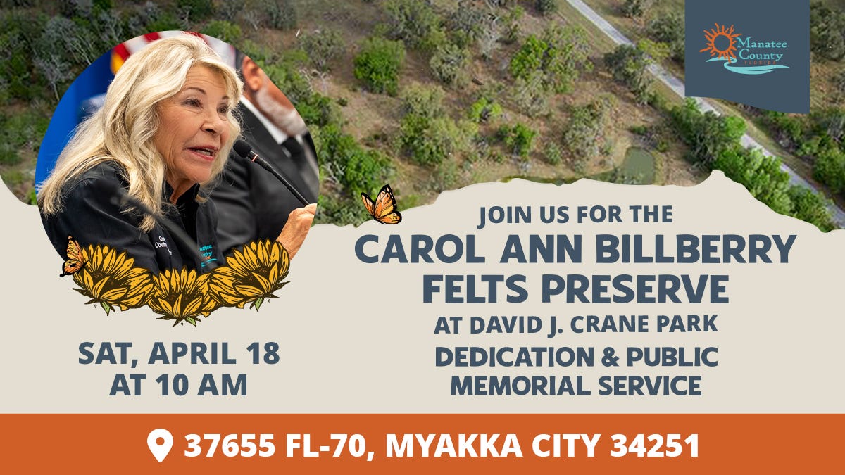 Manatee County will honor the life and legacy of Commissioner Carol Ann Billberry Felts with a dedication and public memorial service on Saturday, April 18, 2026, at 10:00 a.m. at David J. Crane Park in Myakka City.