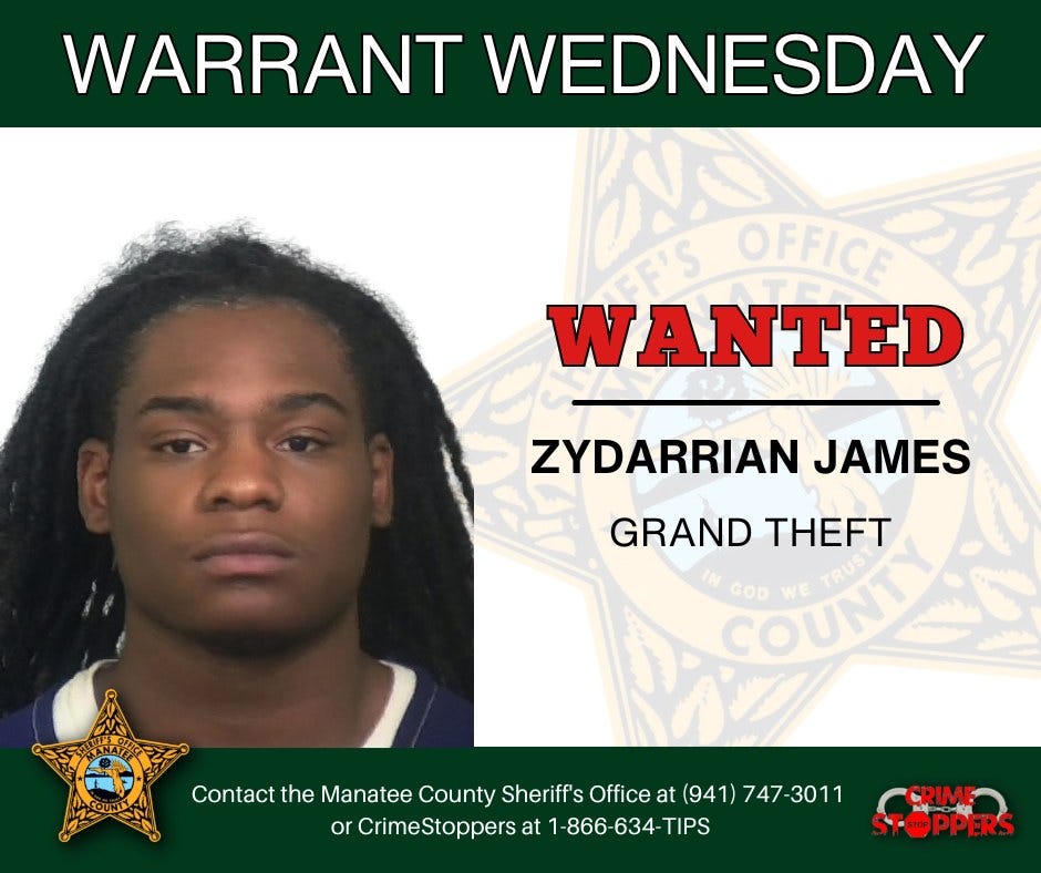 The Manatee County Sheriff’s Office is actively searching for Zydarrian James, who is currently wanted for Grand Theft.