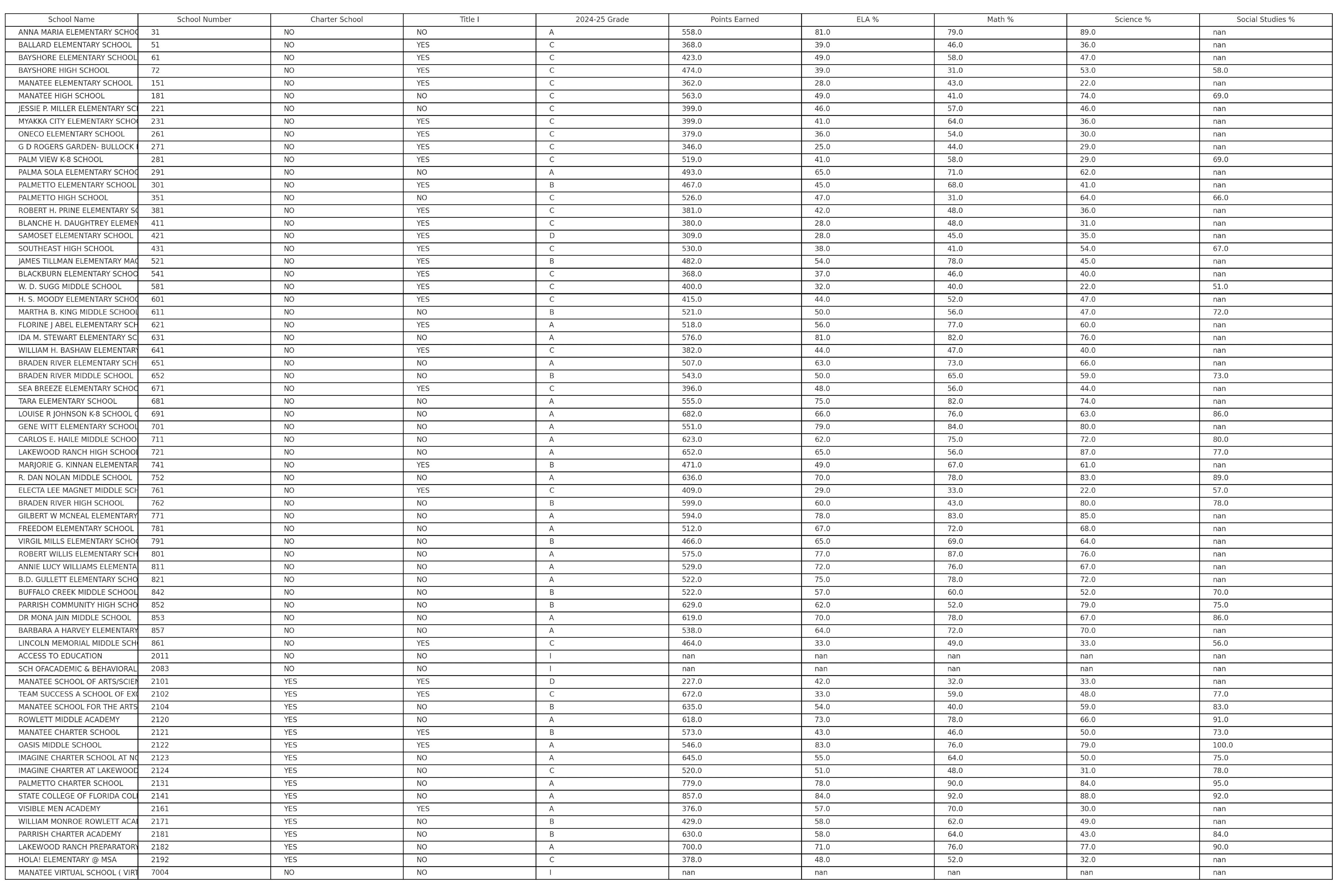 Out of more than 50 public and charter schools in the county, many showed stable or improved academic performance across key metrics, including English Language Arts (ELA), Math, Science, and Social Studies. High-performing campuses such as Anna Maria Elementary, Robert Willis Elementary, and Braden River Elementary earned top marks, with ELA and Math scores well above the state average.