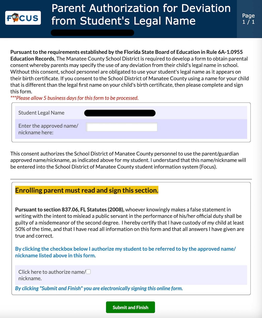 Parents in Manatee County are being asked to complete a new form if their child uses a name other than their legal first name at school. The “Parent Authorization for Deviation from Student’s Legal Name” form is now required by law and must be submitted through the FOCUS Parent Portal.