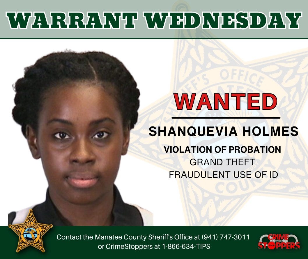 The Manatee County Sheriff’s Office is asking for the public’s assistance in locating Shanquevia Holmes, who is currently wanted for Violation of Probation related to charges of Grand Theft and Fraudulent Use of an ID.