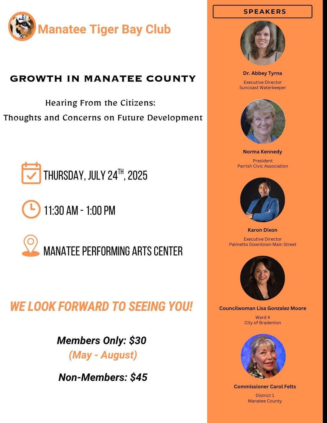 Community growth and development will take center stage at the upcoming Manatee Tiger Bay Club forum, scheduled for Thursday, July 24, 2025, at the Manatee Performing Arts Center.