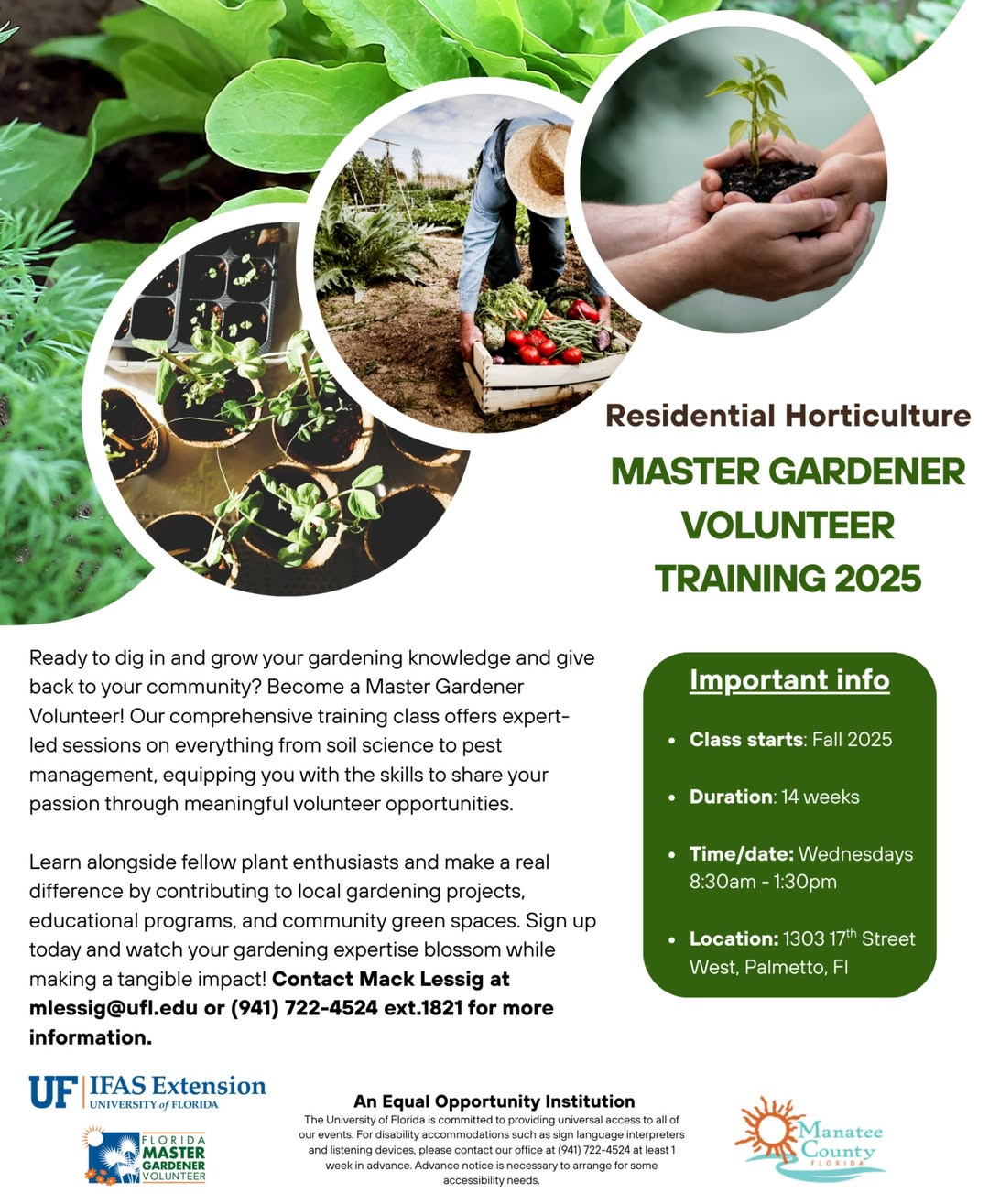 Manatee County residents who love plants and are passionate about helping others can now apply for the Fall 2025 Master Gardener Volunteer training program, hosted by the UF/IFAS Manatee County Extension.