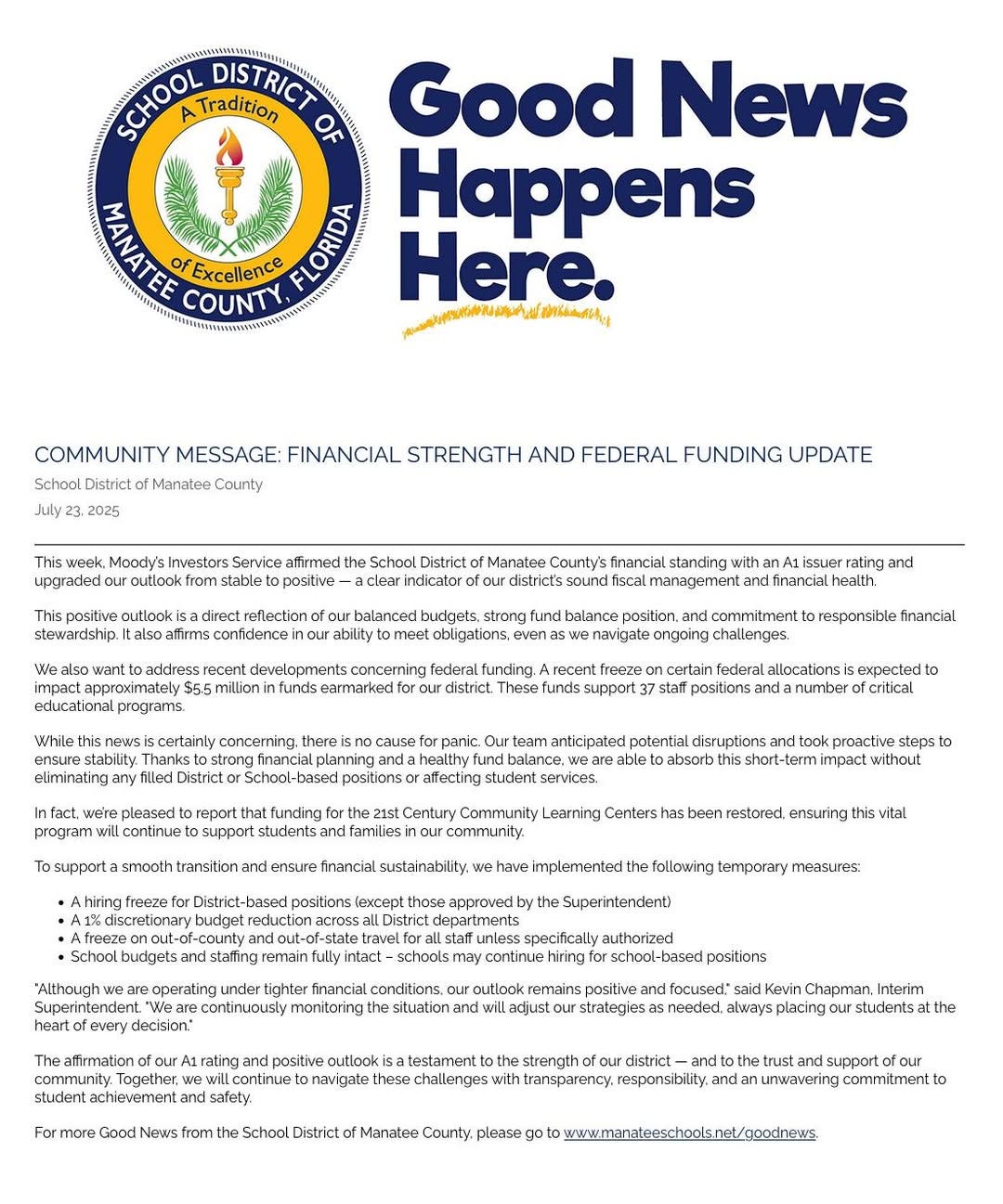 District officials say the improved credit outlook is a testament to the resilience of Manatee County’s schools and the community’s trust. For continued updates, the public is encouraged to visit www.manateeschools.net/goodnews.