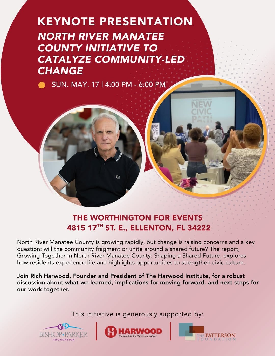 The next phase of that work will be unveiled during a keynote presentation scheduled for May 17 at The Worthington for Events in Ellenton. The gathering will mark the official release of the report, Growing Together in North River Manatee County: Shaping a Shared Future, which highlights key findings from months of community input.