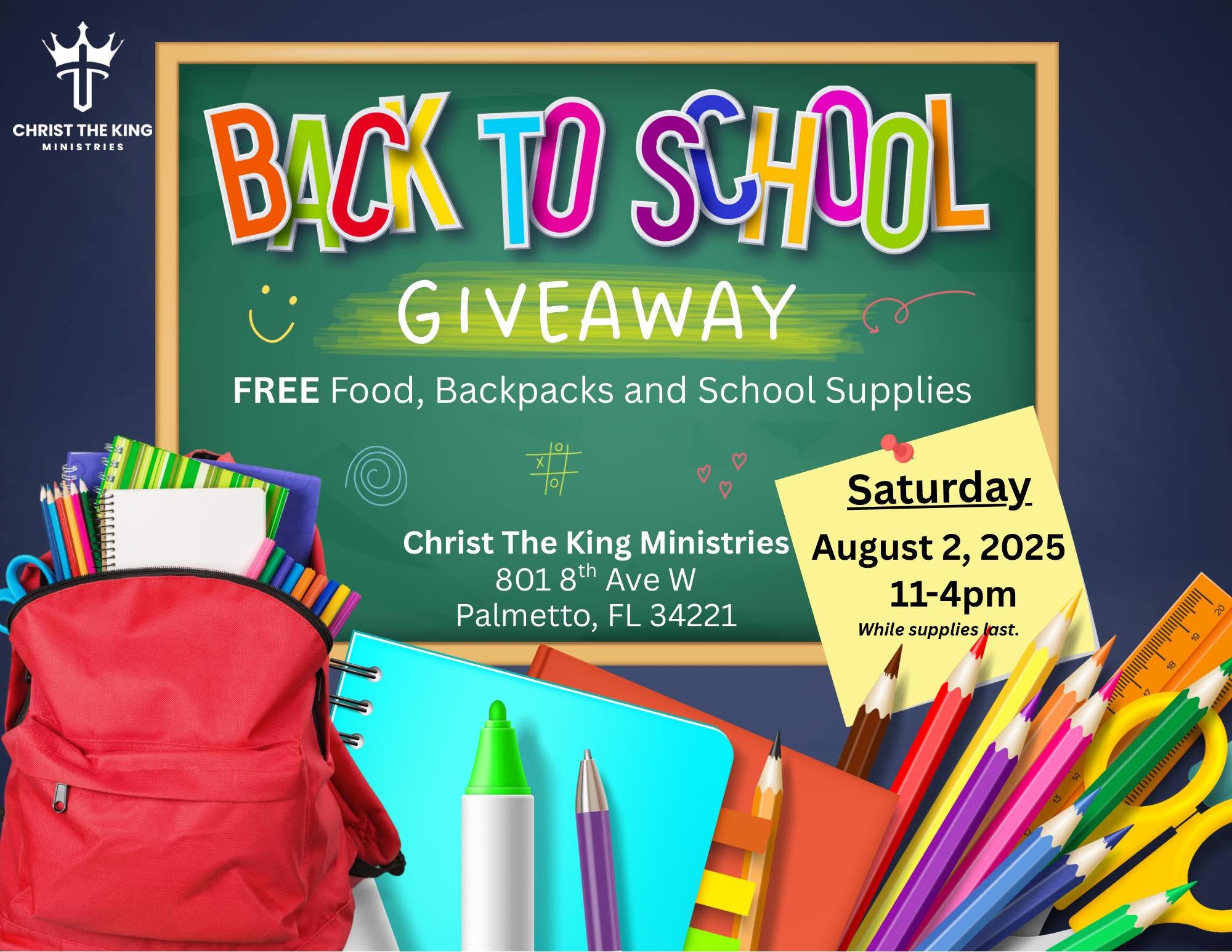 PALMETTO, Fla. — As the new school year approaches, Christ The King Ministries is inviting families to a special Back-to-School Giveaway event on Saturday, August 2, 2025. The event will run from 11 a.m. to 4 p.m. at 801 8th Ave W in Palmetto and aims to unite the community in faith, fellowship, and service.