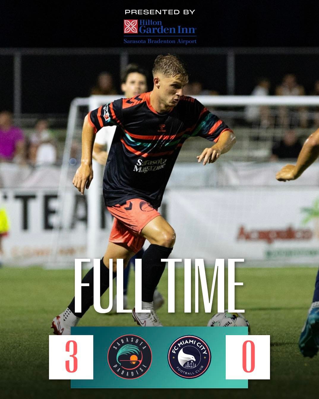 Sarasota Paradise wrapped up their USL League Two regular season in dominant fashion Saturday night, defeating FC Miami City 3–0 at home in front of a record-setting crowd of 1,860 fans.