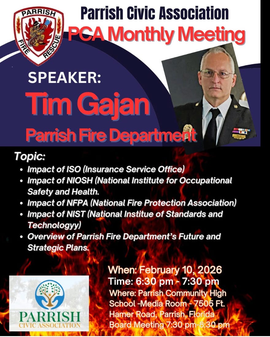 The Parrish Civic Association will hold its February monthly meeting on Tuesday, February 10, featuring a presentation from Parrish Fire Department leadership on fire protection standards, safety frameworks, and the department’s long-term planning.