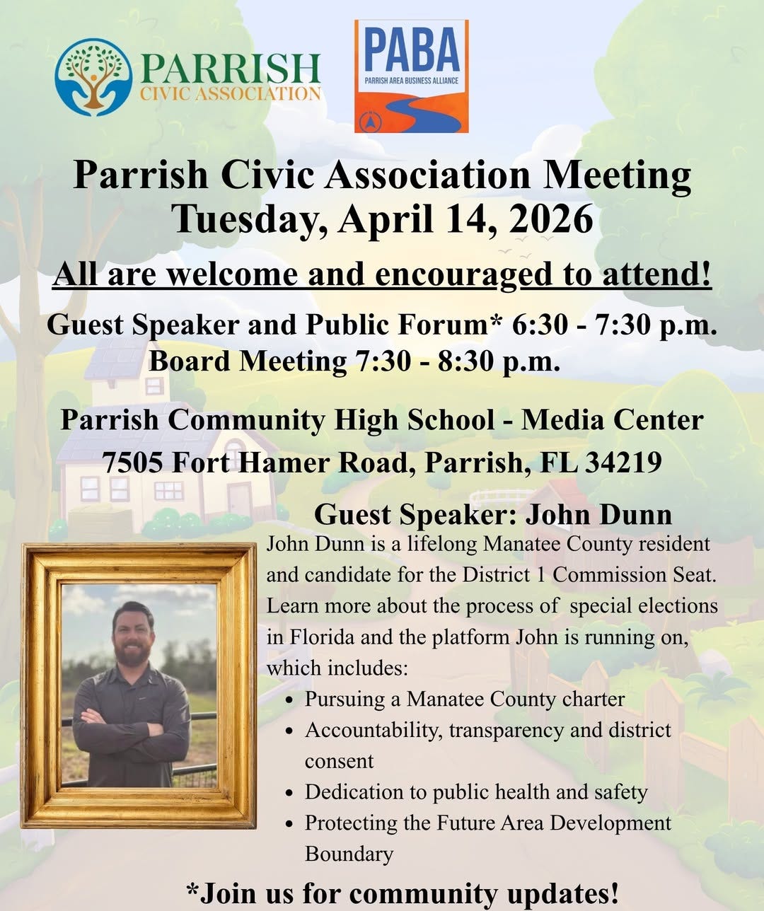 The Parrish Civic Association, in partnership with the Parrish Area Business Alliance, will host a community meeting on Tuesday, April 14, 2026, inviting residents to engage in local issues and hear from a candidate seeking public office.