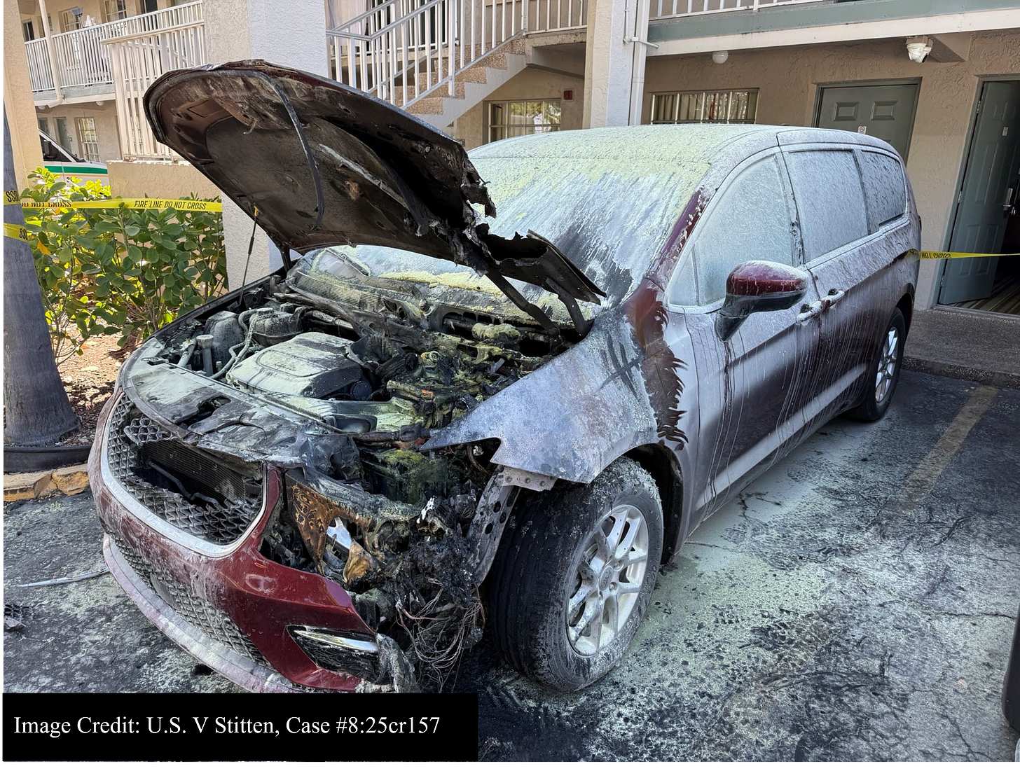 According to court records, the incident occurred on March 20, 2025, when Stitten used a lighter and a t-shirt to ignite a van parked in a motel lot in Bradenton. The vehicle had been rented by a couple visiting from Oregon through Tampa International Airport. The fire caused damage to the van.