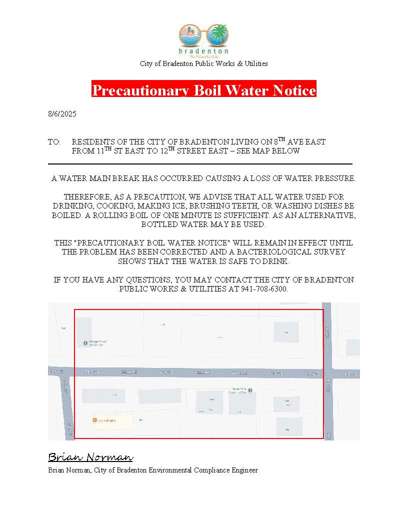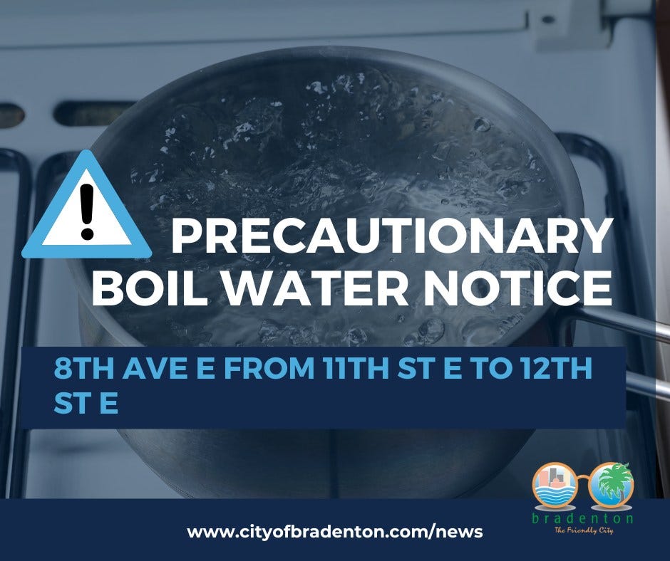 The City of Bradenton has issued a precautionary boil water notice for residents and tenants located on 8th Avenue East from 11th Street East to 12th Street East, following a water main break that resulted in a temporary loss of water service and pressure in the area.