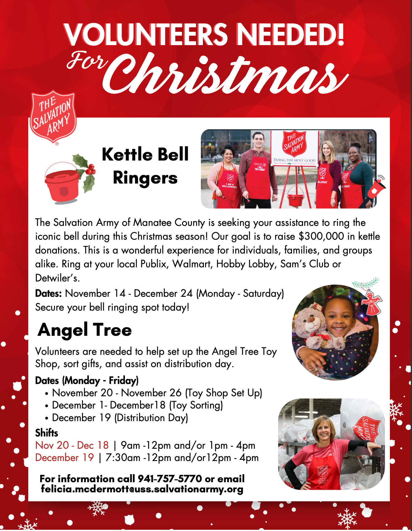 Kettle Bell Ringers: Volunteers are needed from November 14 through December 24 (Monday through Saturday) to ring the iconic red kettle bells at local locations, including Publix, Walmart, Hobby Lobby, Sam’s Club, and Detwiler’s. The goal this season is to raise $300,000 in donations.