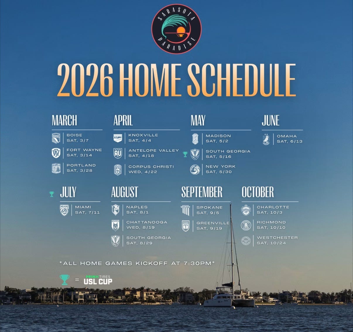 Sarasota Paradise has released its 2026 home schedule, outlining a full slate of matches that will bring elite-level soccer back to Sarasota throughout the spring, summer and fall.