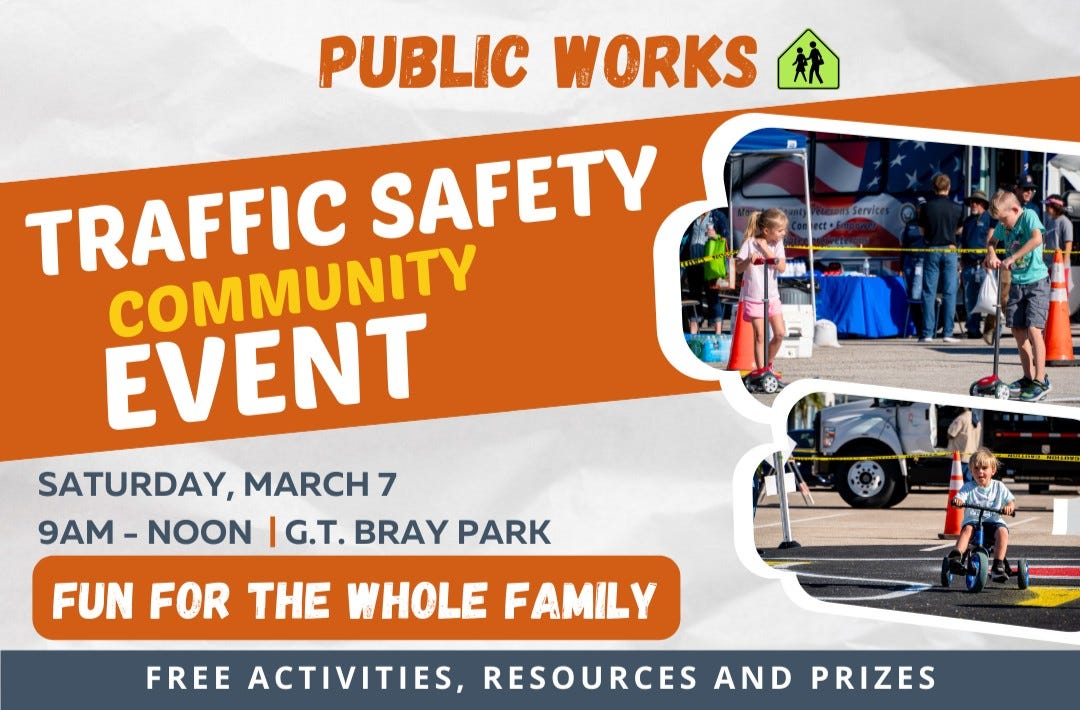 Manatee County Government will host its Traffic Safety Community Event from 9 a.m. to noon at G.T. Bray Park in Bradenton. The free event features bike helmet giveaways, traffic safety education and a kid-friendly traffic garden designed to teach young residents safe riding skills.