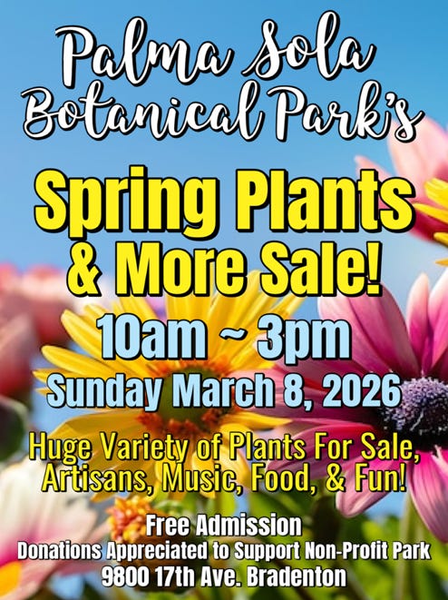 Palma Sola Botanical Park will host its Spring Plants and More Sale on Sunday, March 8, from 10 a.m. to 3 p.m. at 9800 17th Ave. NW in Bradenton. The free-admission event features a wide variety of plants, artisan vendors, food, music and family-friendly activities, with donations supporting the nonprofit park.