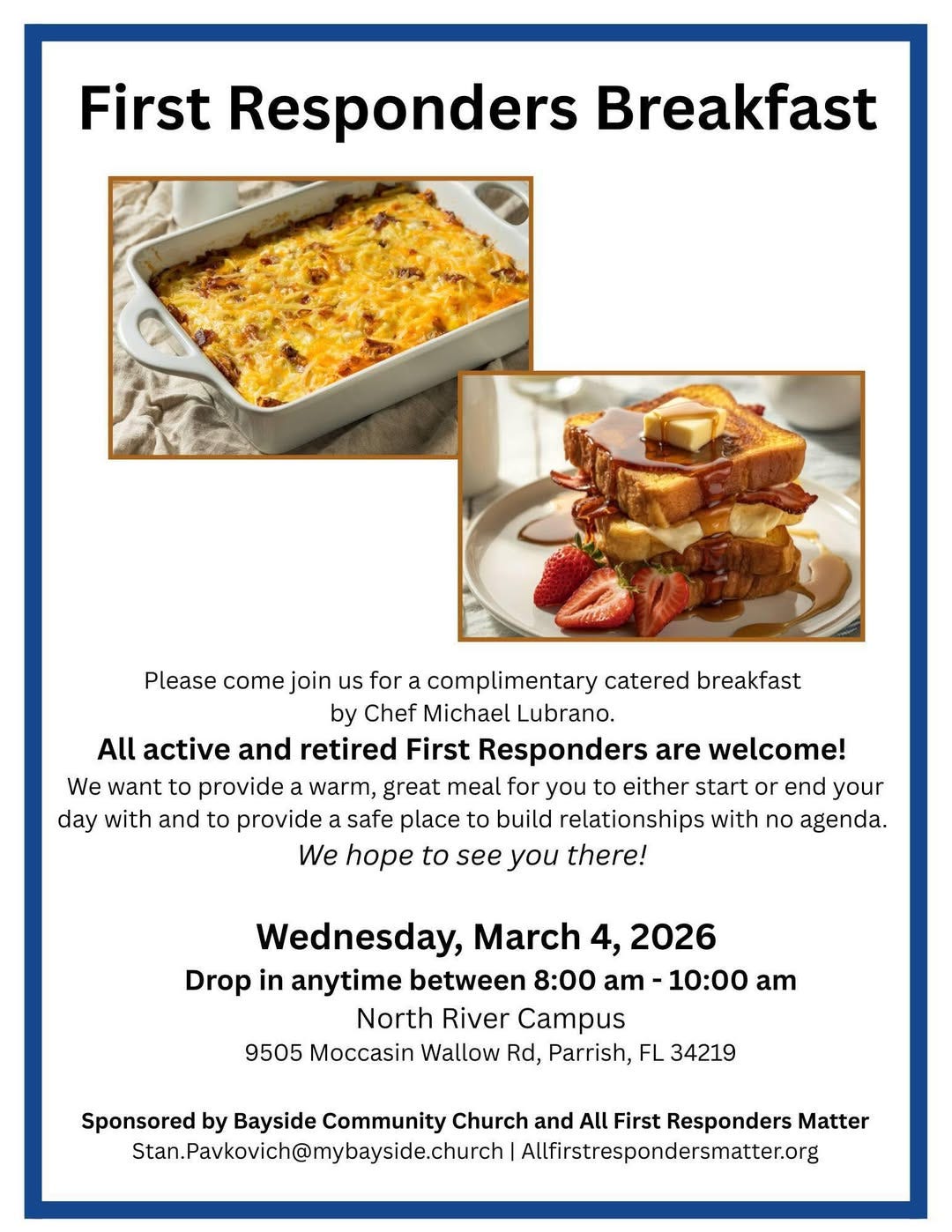 Kicking off the week, Bayside Community Church and All First Responders Matter will host a complimentary First Responders Breakfast on Wednesday, March 4, from 8 to 10 a.m. at the North River Campus in Parrish. The event offers a warm meal and time for connection for active and retired first responders.