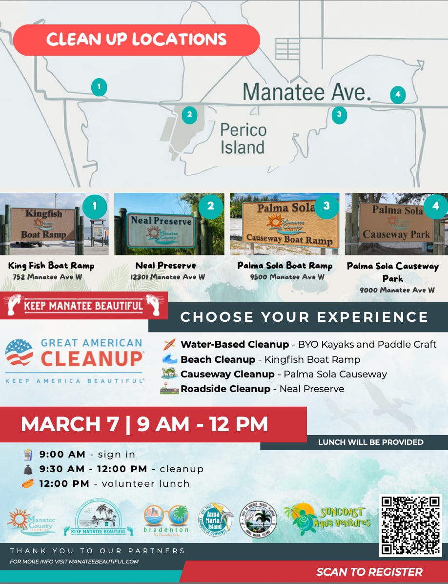 That morning, volunteers can participate in the Great American Cleanup from 9 a.m. to noon at multiple locations, including Kingfish Boat Ramp, Neal Preserve, Palma Sola Boat Ramp, and Palma Sola Causeway Park. Organized through Keep Manatee Beautiful, the event includes beach, roadside, causeway and water-based cleanups, followed by lunch for volunteers.