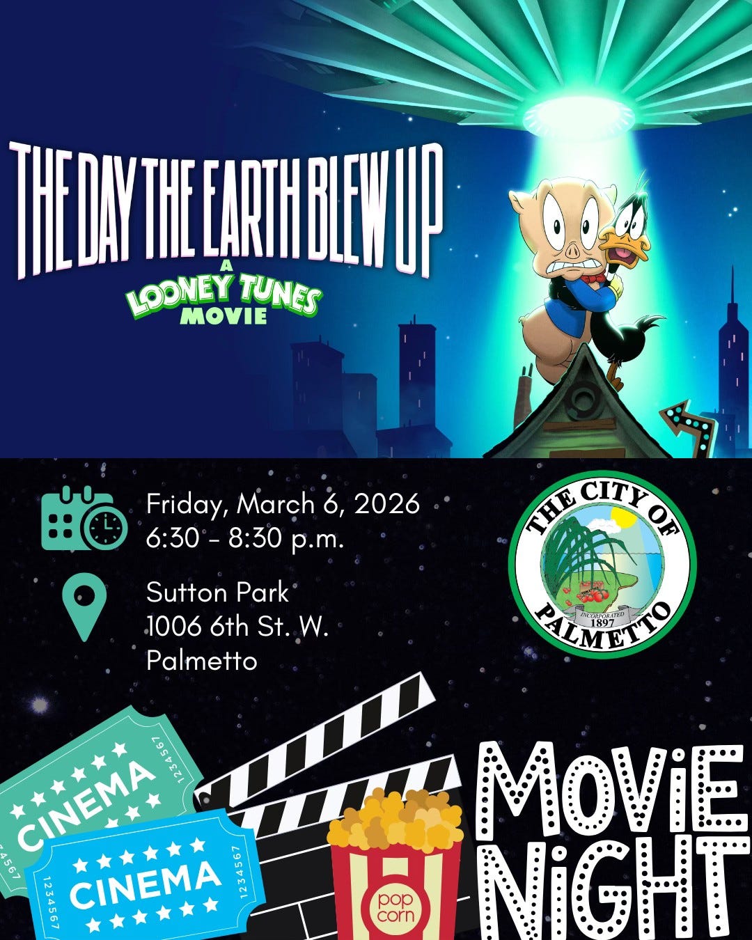 Also on Friday, March 6, families can head to Sutton Park in Palmetto for Movie Night featuring The Day the Earth Blew Up: A Looney Tunes Movie. Hosted by the City of Palmetto, the free outdoor movie begins at 6:30 p.m. at 1006 Sixth St. W., offering an evening of community fun under the stars.