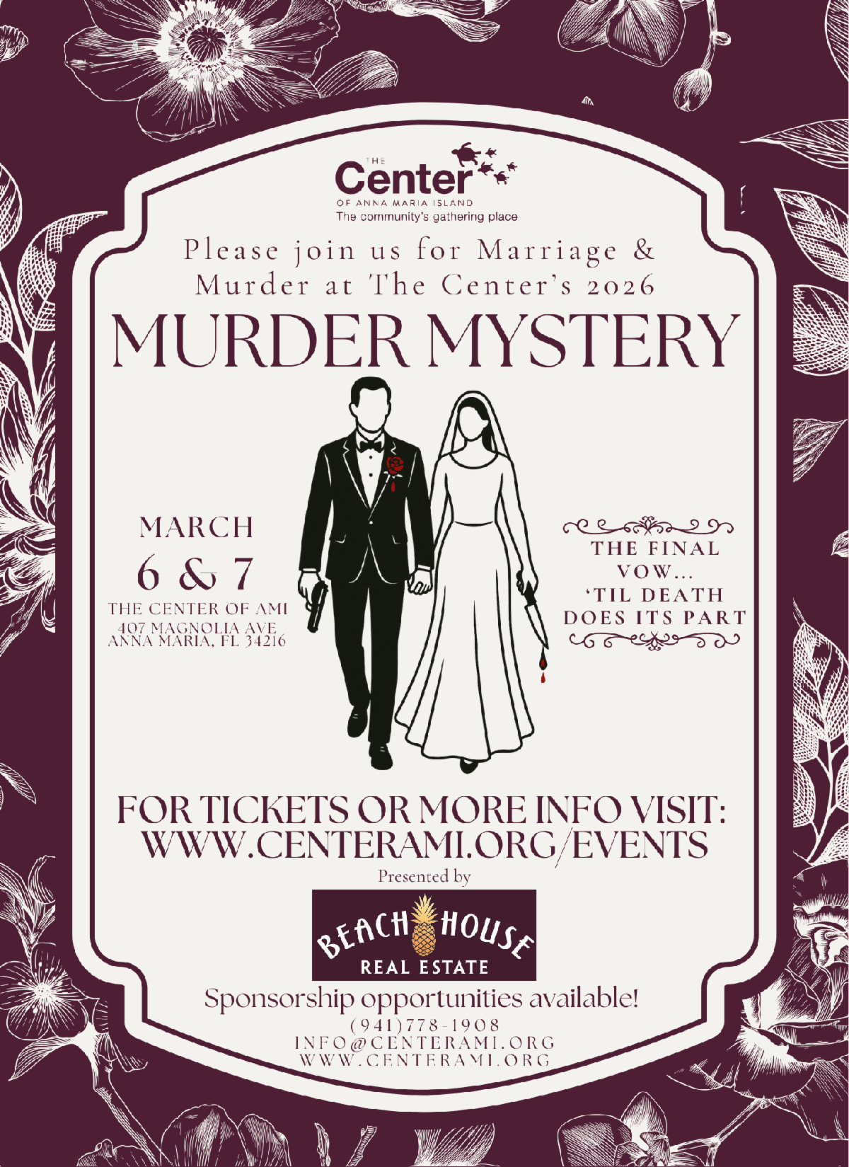 That same evening, March 6, the Center of Anna Maria Island presents its 17th Annual Murder Mystery Dinner, The Final Vow… ’Til Death Does Its Part, with additional performances on Saturday, March 7. The adult-only event combines dinner and interactive entertainment for a suspense-filled night.