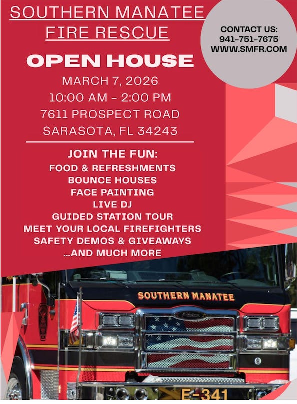 Southern Manatee Fire Rescue will open its doors for an Open House on March 7 from 10 a.m. to 2 p.m. at Station 1 on Prospect Road in Sarasota. Families can enjoy station tours, safety demonstrations, bounce houses and opportunities to meet local firefighters.