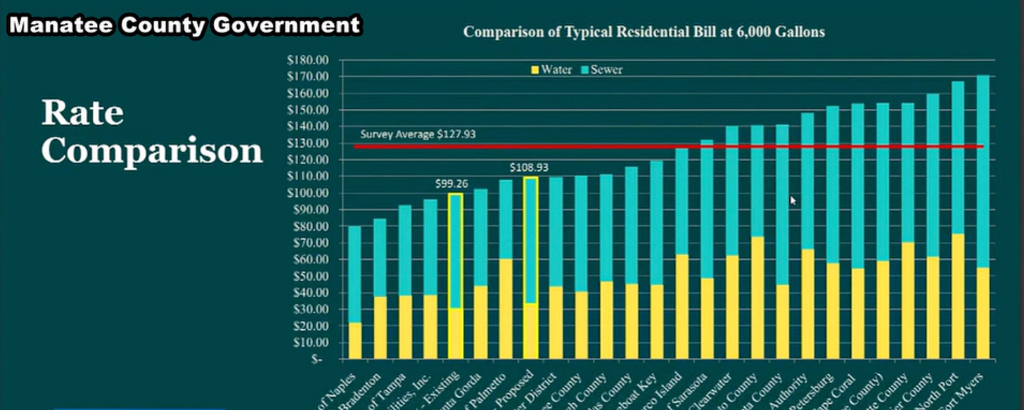 Shea noted that as an enterprise fund, the utilities system is designed to be self-supporting, meaning user fees—not general tax dollars—should cover operating and capital expenses. He also pointed out that even with the projected adjustments, Manatee County’s average water rates would remain below the national average.