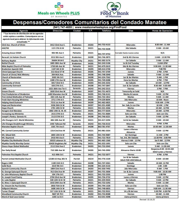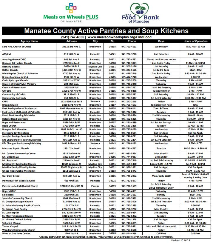 The Food Bank of Manatee will host an Emergency Drive-through Food Distribution* on Tuesday, November 4, 2025, at Dream Church, located at 1820 53rd Ave. East, Bradenton, Florida, 34207, from 4:00 pm to 6:00 pm. Non-perishable food items will be provided free of charge.