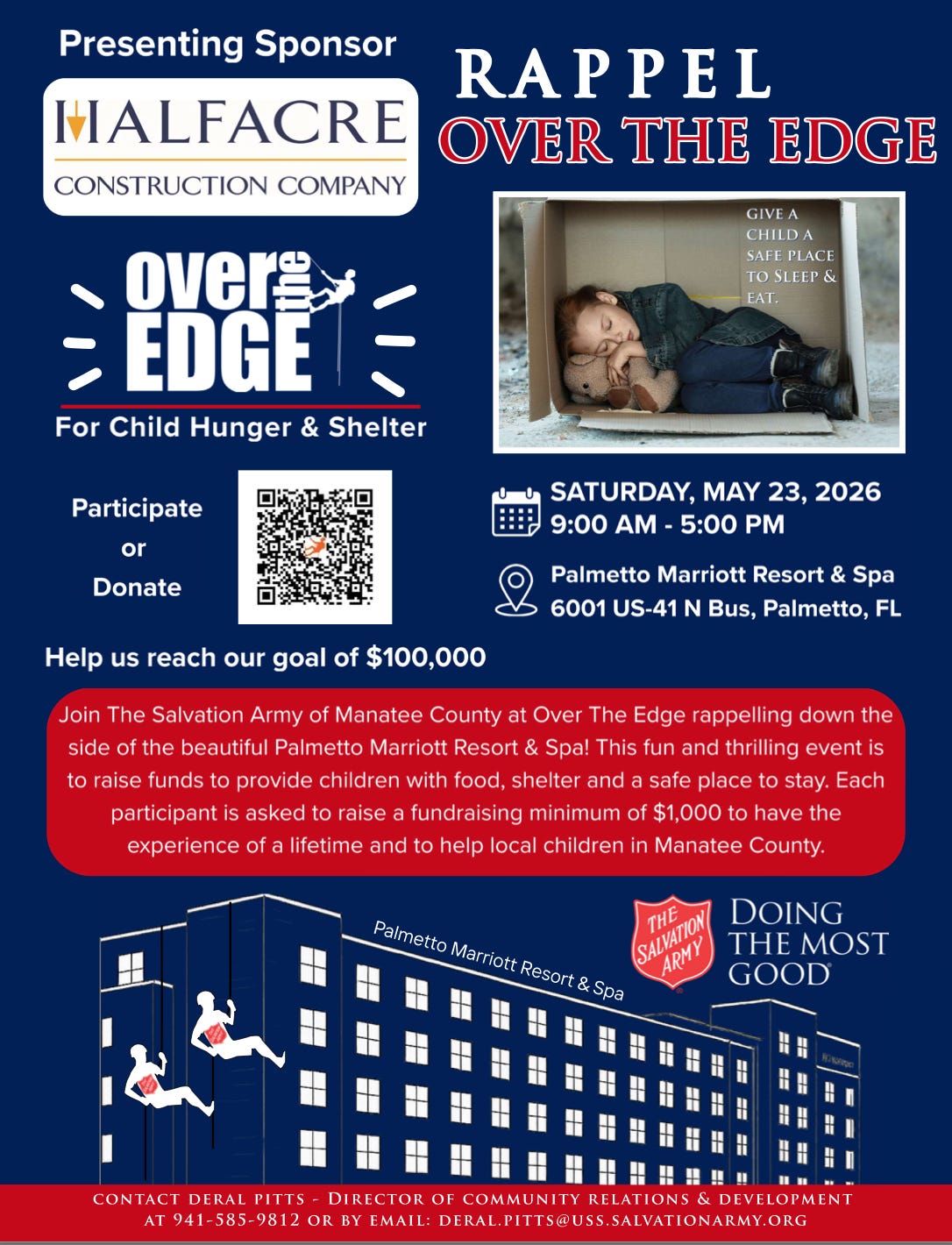 The Salvation Army of Manatee County is thrilled to announce its upcoming, First Annual “Over the Edge” event, a unique fundraiser where brave and courageous participants rappel down the side of the Beautiful Palmetto Marriott Resort & Spa to support child hunger, shelter, and families experiencing homelessness in our community. This safe, fun, and exhilarating event challenges thrill-seekers and compassionate supporters alike to conquer their fears and make a tangible difference in the lives of homeless children. Our goal is to raise $100,000.