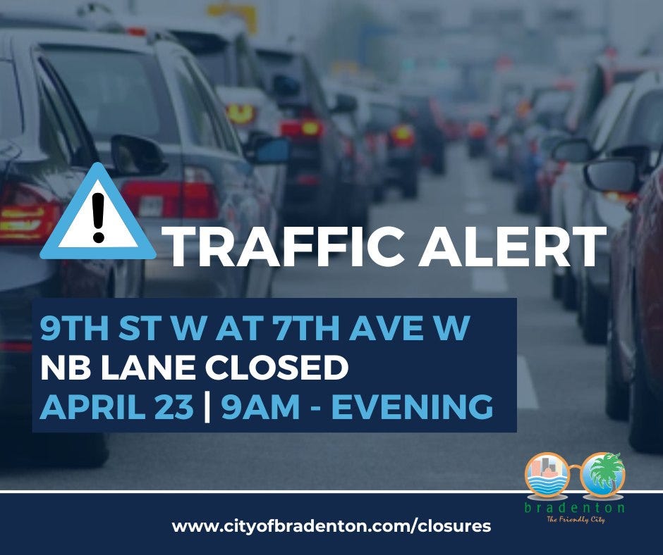 One northbound lane at 9th Street West and 7th Avenue West will be closed beginning at 9 a.m. for striping and curb improvements. The closure is expected to remain in place throughout the day, with the lane reopening by the evening.