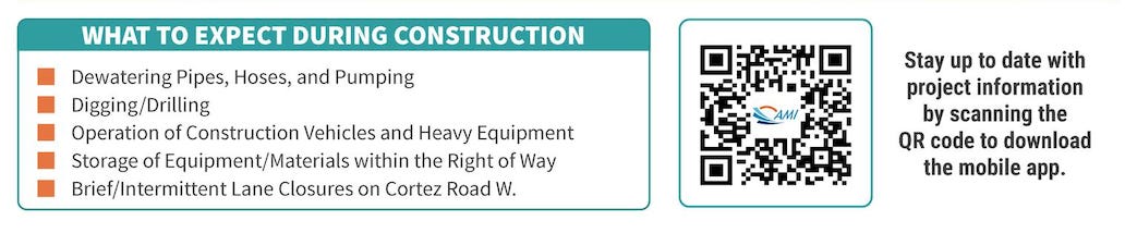 Residents should also expect activity such as dewatering pipes, drilling operations, and the presence of construction vehicles and equipment along the right-of-way. Brief and intermittent lane closures may occur on Cortez Road West as crews perform necessary work.