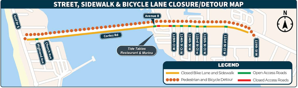 The Cortez Bridge Utility Relocation Project is currently taking place on the south side of Cortez Road West near the bridge. Crews have begun installing pipes on both the north and south sides of the roadway, with work expected to continue through the summer of 2026. As construction progresses, residents and visitors may encounter intermittent lane shifts, flagging operations, and closures affecting sidewalks and bicycle lanes.
