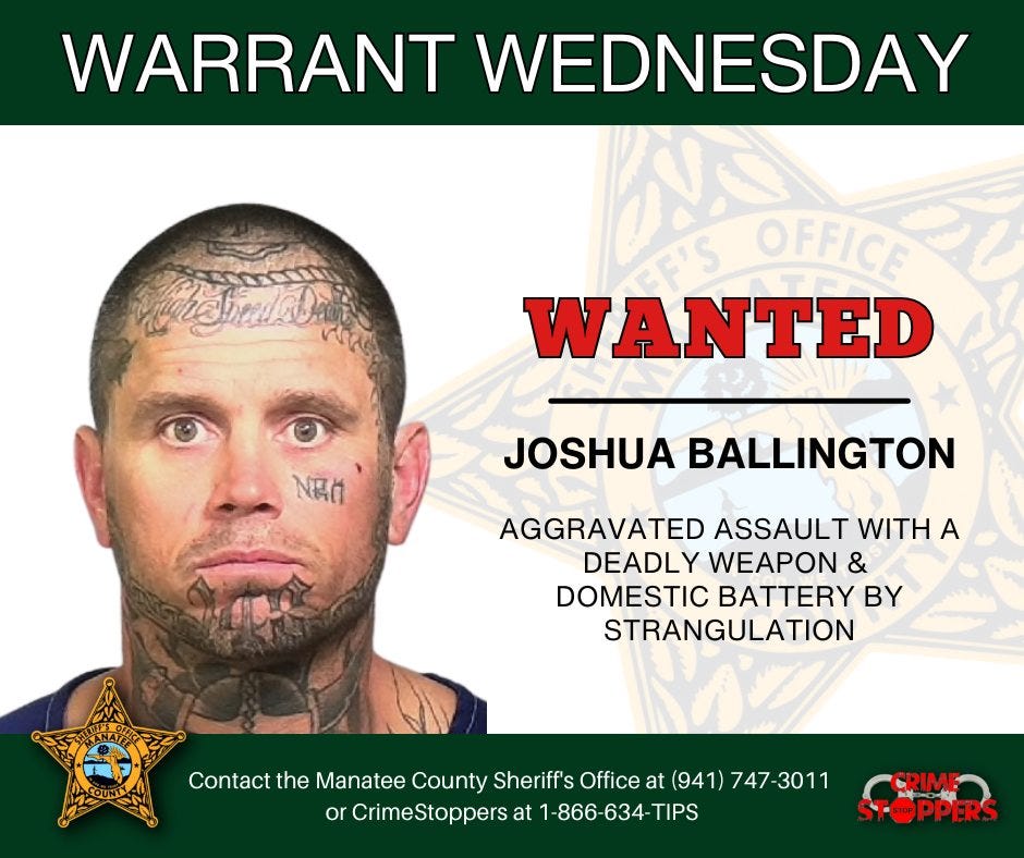 The Manatee County Sheriff’s Office is seeking the public’s assistance in locating Joshua Ballington, who is wanted on charges of aggravated assault with a deadly weapon and domestic battery by strangulation.