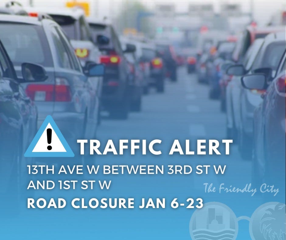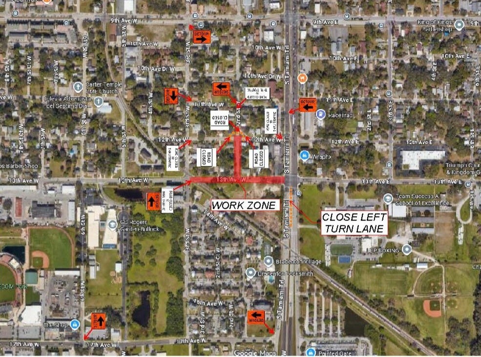 The project will require the full closure of 13th Avenue West between 3rd Street West and 1st Street West, as well as 2nd Street West between 12th Avenue West and 13th Avenue West. In addition, the left-turn lane on 1st Street West/South Tamiami Trail at 13th Avenue West will be closed during construction.