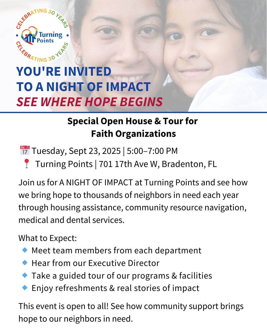 On Tuesday, September 23, the nonprofit Turning Points will host A Night of Impact from 5:00 to 7:00 p.m. at its Bradenton campus on 17th Avenue West. Guests will meet team members, tour facilities, and hear how the organization provides housing assistance, community navigation, and medical and dental services to neighbors in need.