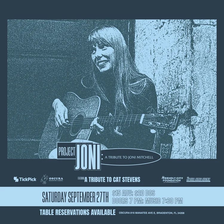 Meanwhile, in downtown Bradenton, Oscura will present Project JONI, a live tribute to Joni Mitchell and Cat Stevens, beginning at 7:00 p.m.