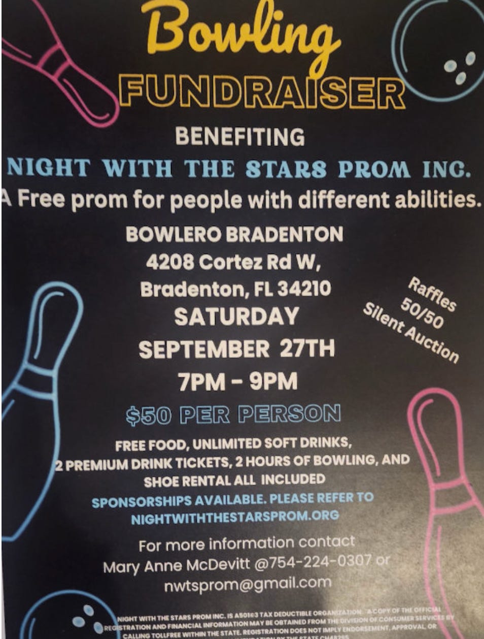 The weekend brings a mix of fundraising and entertainment. On Saturday, September 27, Night With the Stars Prom, Inc. will benefit from a bowling fundraiser at Bowlero Bradenton, located on Cortez Road, from 7:00 to 9:00 p.m. Proceeds support a free prom experience for individuals with different abilities. Tickets are $50 and include food, soft drinks, two premium drink tickets, bowling, and shoe rental, along with raffles and a silent auction.