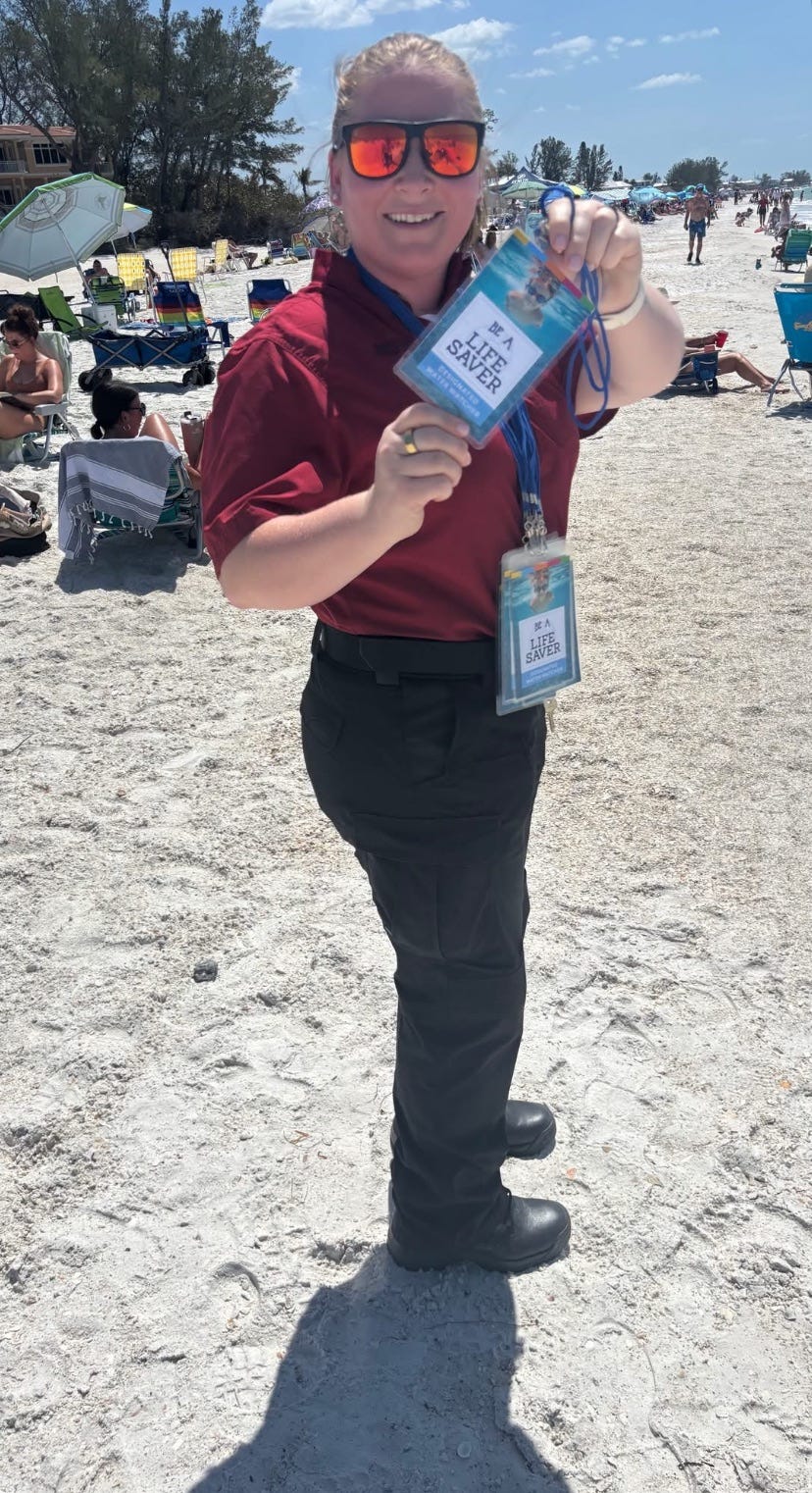 During a recent West Manatee Fire Rescue “Walk for Life”, WMFR Fire Inspector Cierra Price walks Manatee Public Beach, passing out Water Watcher badges.