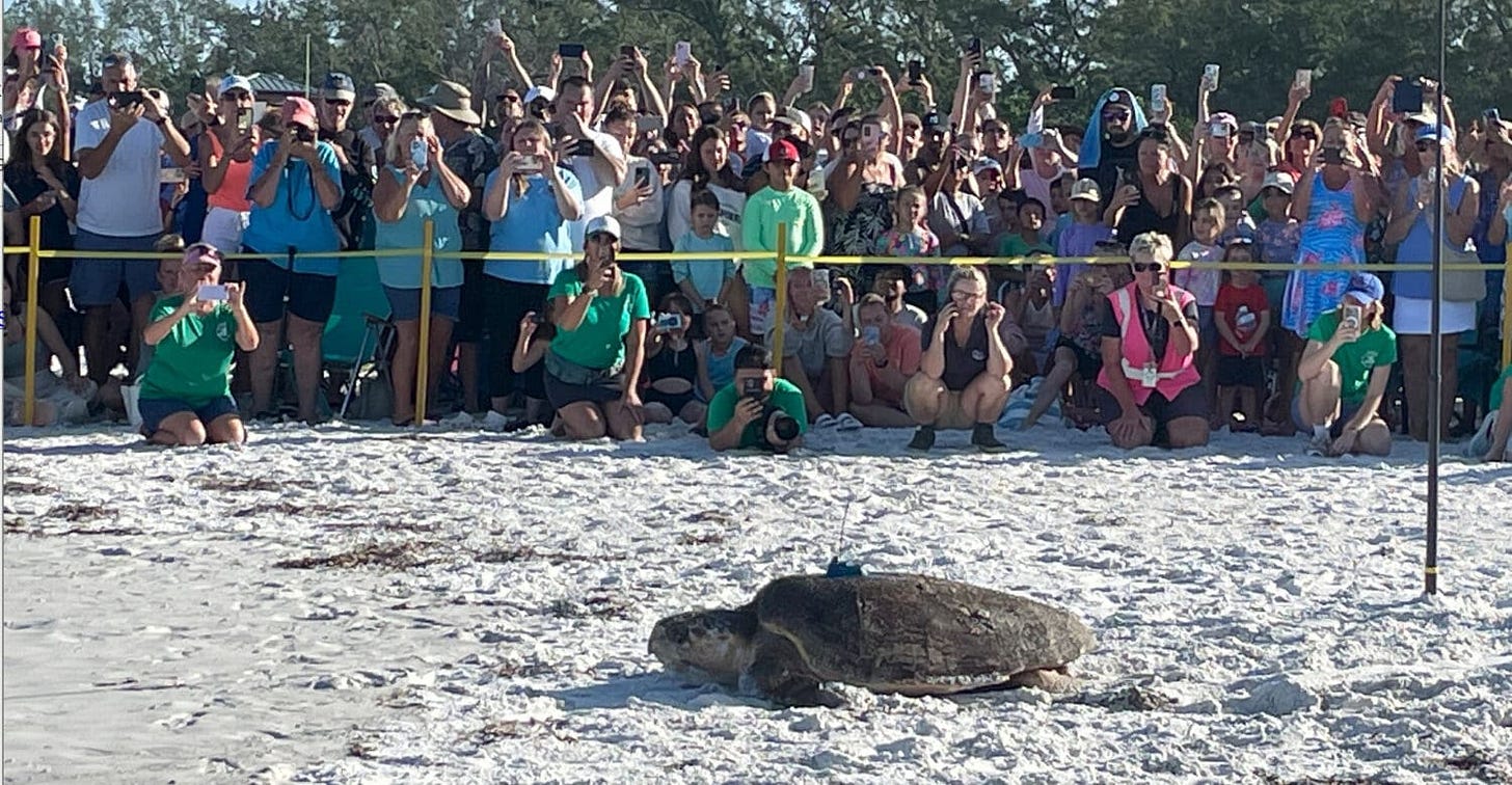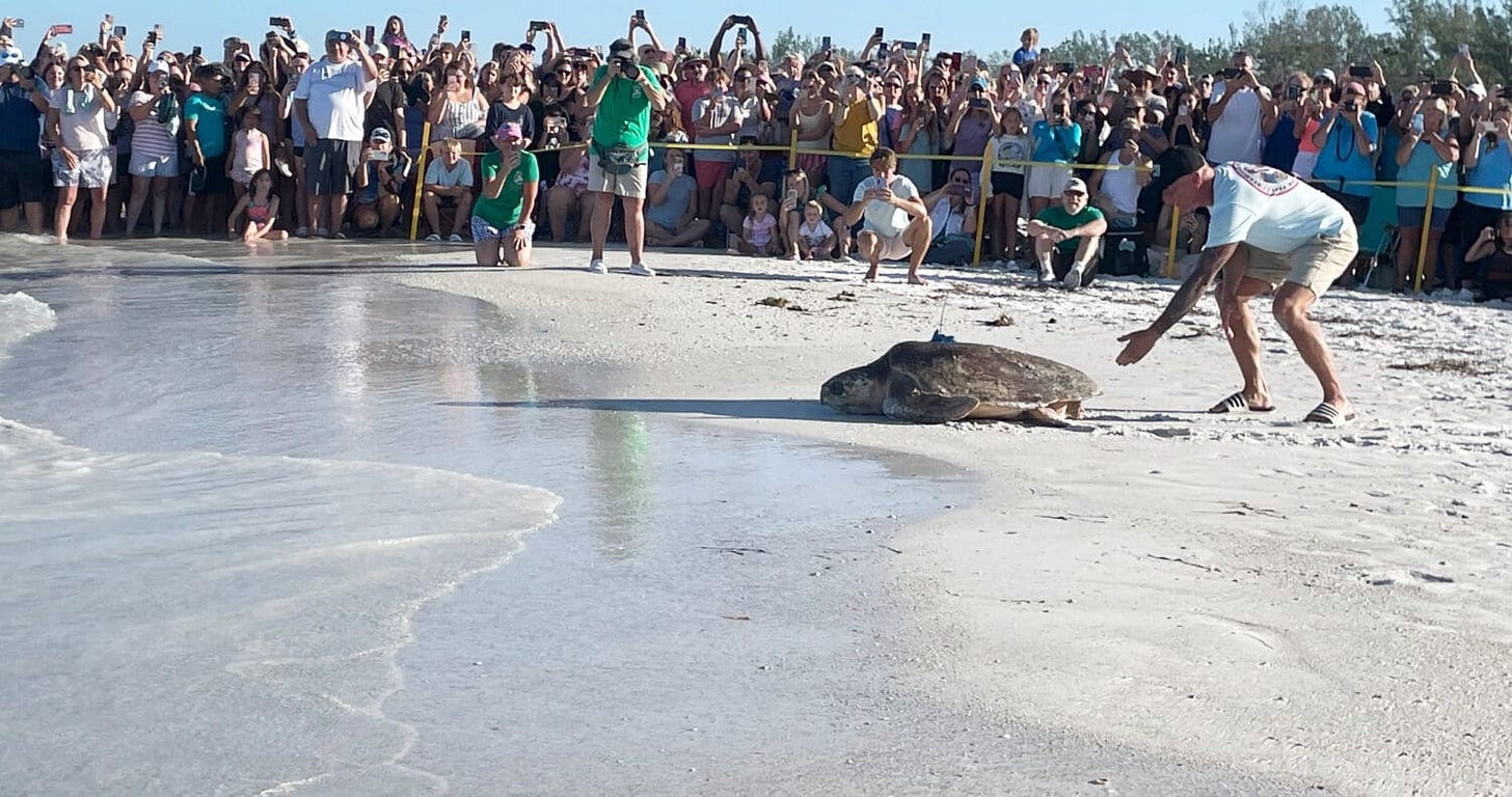 BRADENTON BEACH, Fla. — A large crowd gathered Monday morning at Coquina Beach to witness the inspiring release of a loggerhead sea turtle named Winnie, who captivated onlookers as she made her way toward the Gulf of Mexico.